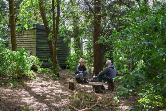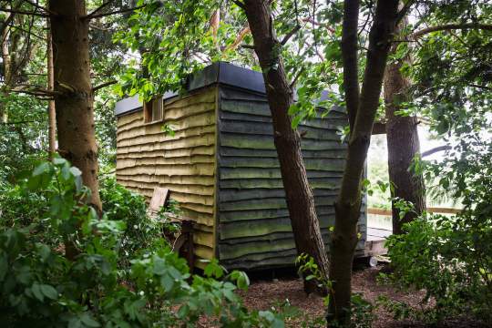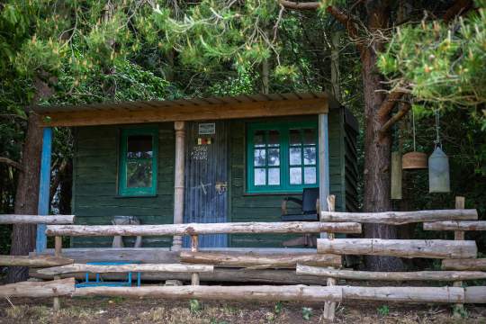 A rustic off grid hut, built from recycled materials, in a sunny spot on the edge of a small wood. Well off the beaten track.