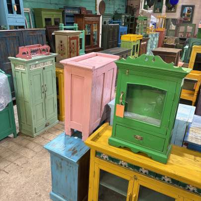 Cupboards of all shapes and sizes, sideboards, boxes, mirrors, chairs, stools, tables, pictures, bits and pieces for the garden and so much more. From very small to quite large pieces! All hand chosen by us on our last trip to India.